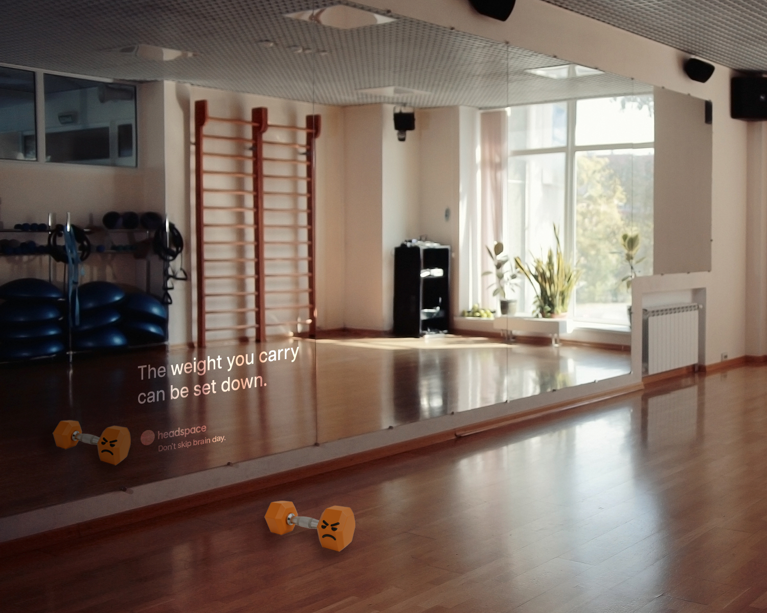Headspace will bring the idea of mental health into the gym by turning everyday stressors into physical weights. Additionally we’ll place targeted copy around the gym to gently and unobtrusively remind our audience that their brain deserves as much attention as their quads.