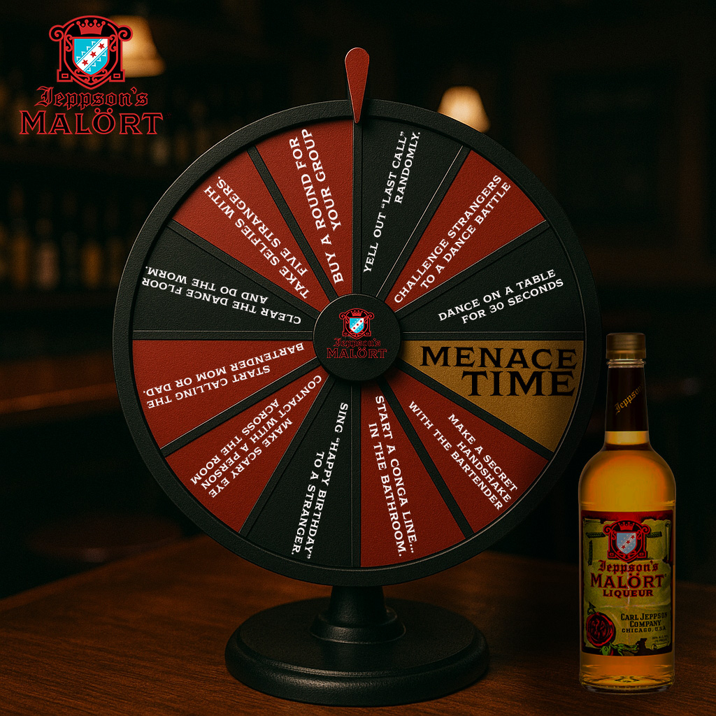 If you land on a regular dare, you’re stuck with it. If you land on Menace Time, you take a shot of Malört and earn another spin. It’s a fun way to double your chaos and keep the menace energy going.
